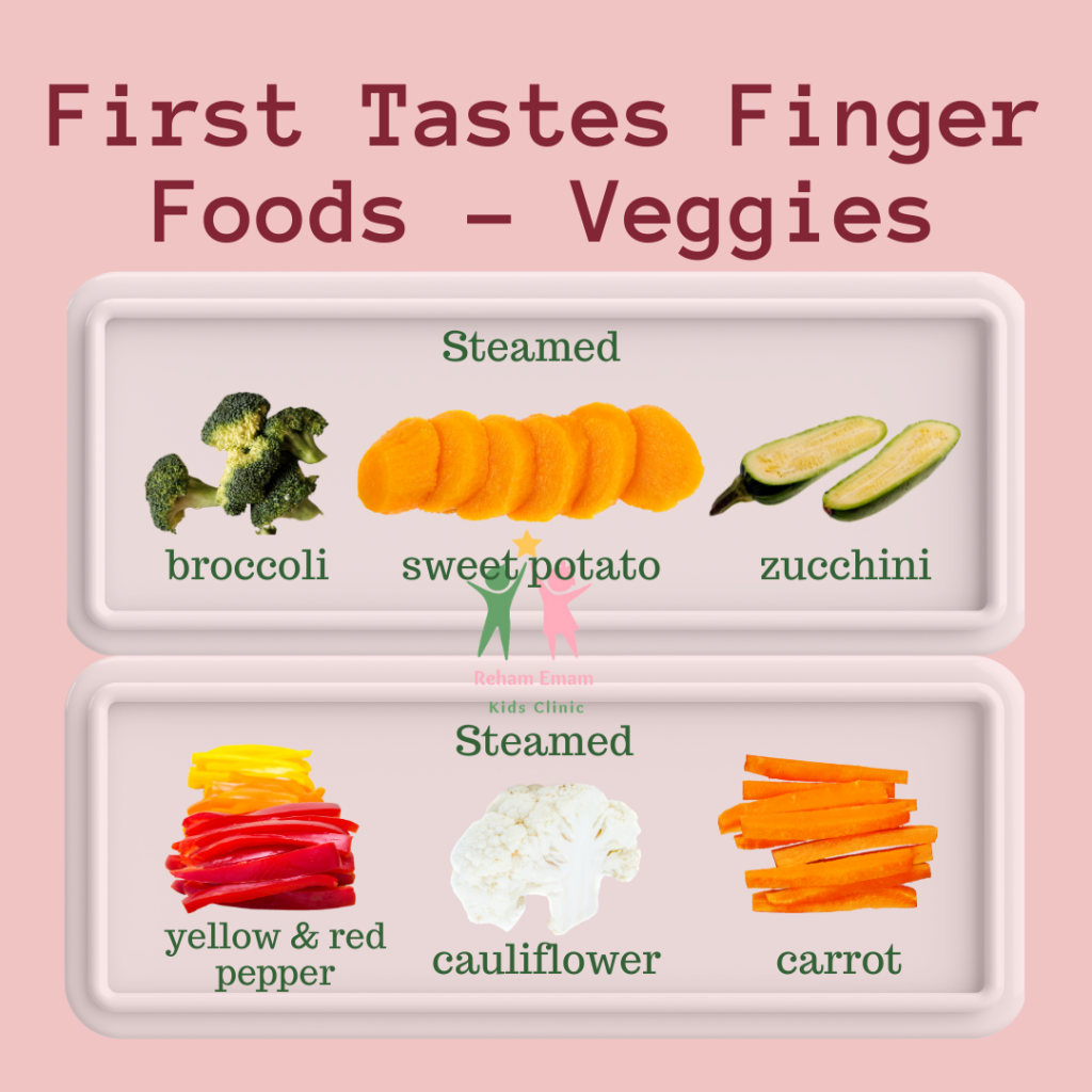 - Finger foods: Offer soft, easily-grasped foods like steamed vegetables, soft fruits, small pieces of cooked chicken or fish, and small pieces of cooked pasta. But not very small to avoid choking hazards.